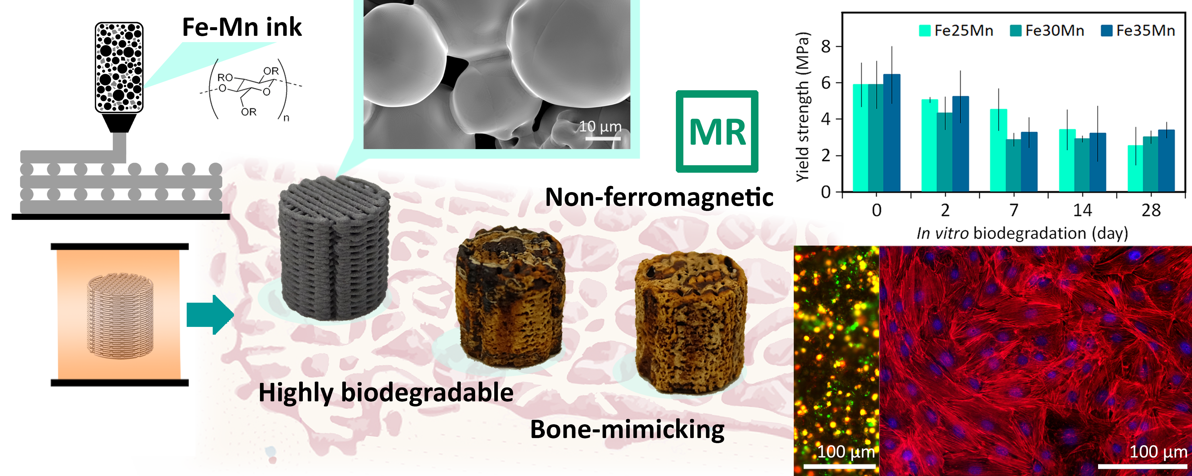 We modified the material chemistry of pure iron to resolve the issues concerning the ferromagnetic behavior and lack of bioactivity. We implemented the multi-material 3D printing strategy by alloying Fe with manganese (Mn) and reinforcing Fe with akermanite (Ca-Mg-Si-based bioactive ceramics) and thoroughly evaluated the performance of the scaffolds, including the magnetic behavior and osteogenic potential.