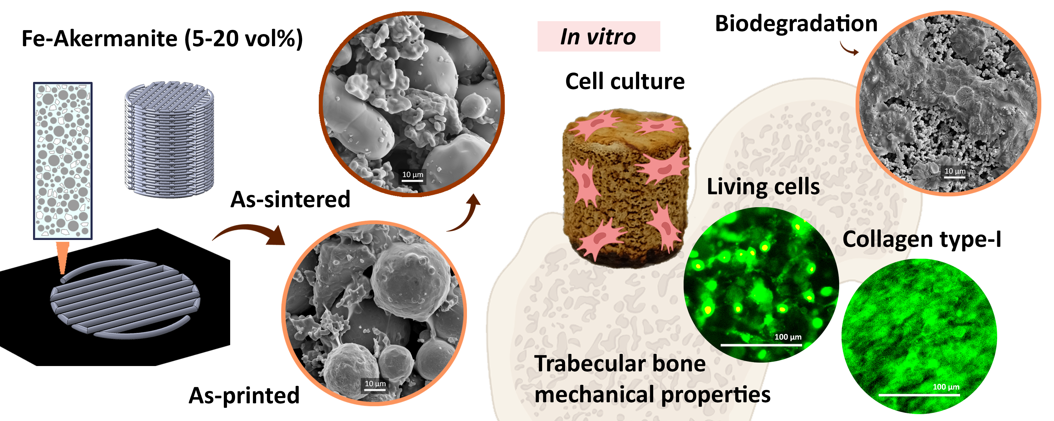 With the expected benefits gained individually from alloying with Mn and compositing with akermanite, we developed the FeMn-akermanite composite scaffolds, taking advantage of the multi-material capacity of extrusion 3D printing. Our results clearly demonstrated that the extrusion 3D printed porous FeMn-akermanite scaffolds could fulfill all the requirements for bone substitution in vitro.